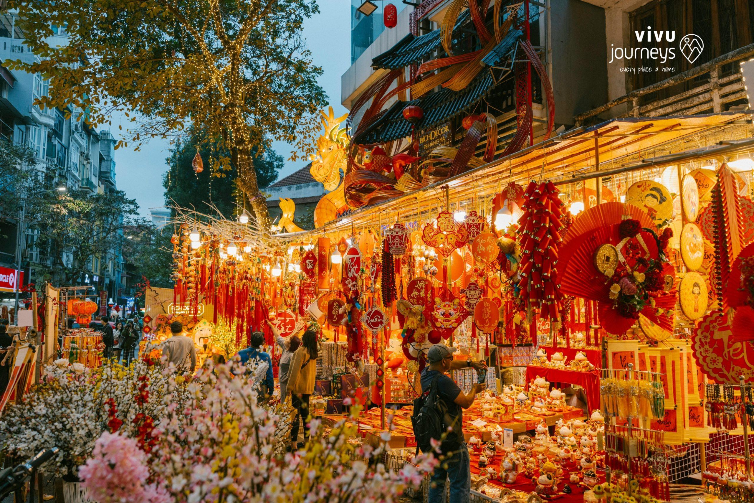 Decorations play a vital role in setting the festive mood. Kumquat trees, representing prosperity and fertility, and flowering plants such as Peach Blossoms (in the North) and Apricot Blossoms (in the South) are displayed prominently in homes and public spaces. Red banners with auspicious phrases, such as “Chuc Mung Nam Moi” (Happy New Year), adorn walls and doorways, adding to the celebratory atmosphere.
