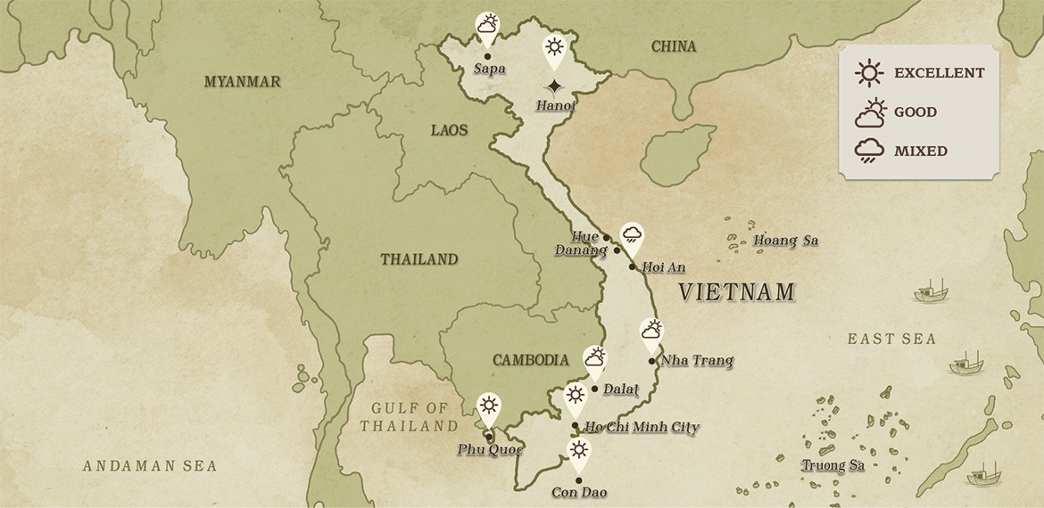 The wet season is generally from April to October while the dry season runs from November to March. It is good to note that Vietnam’s climate varies depending on the time of year and geographic location. Overall, when the weather isn’t ideal in one area, it may be great in another.